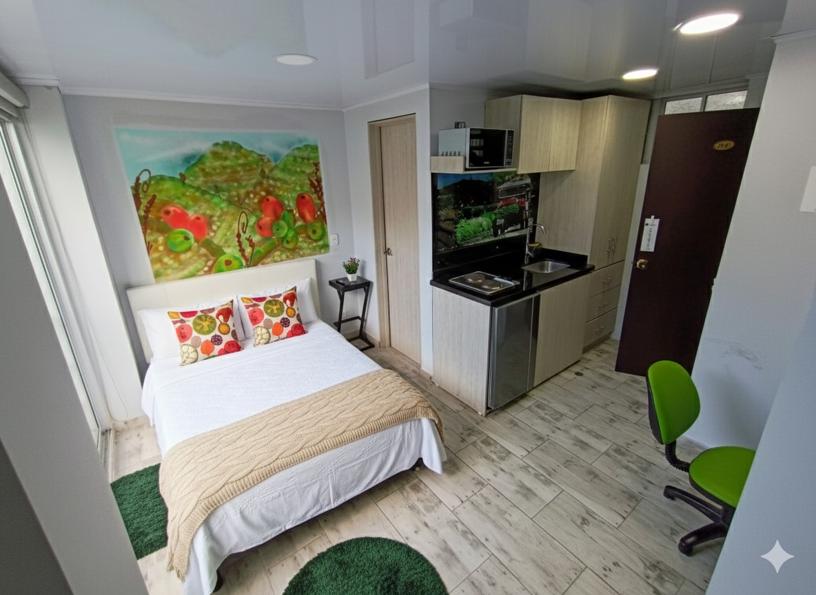 Suites de 38 m2 en la mejor zona de Bogota, junto a los mas exclusivos centros comerciales, restaurantes y clinicas. Ventanas Insonorizadas, Cama BoLiving ideal para un buen descanso. Baño Completo en Habitacion, y Baño Social en zona social. Recepcion 24H