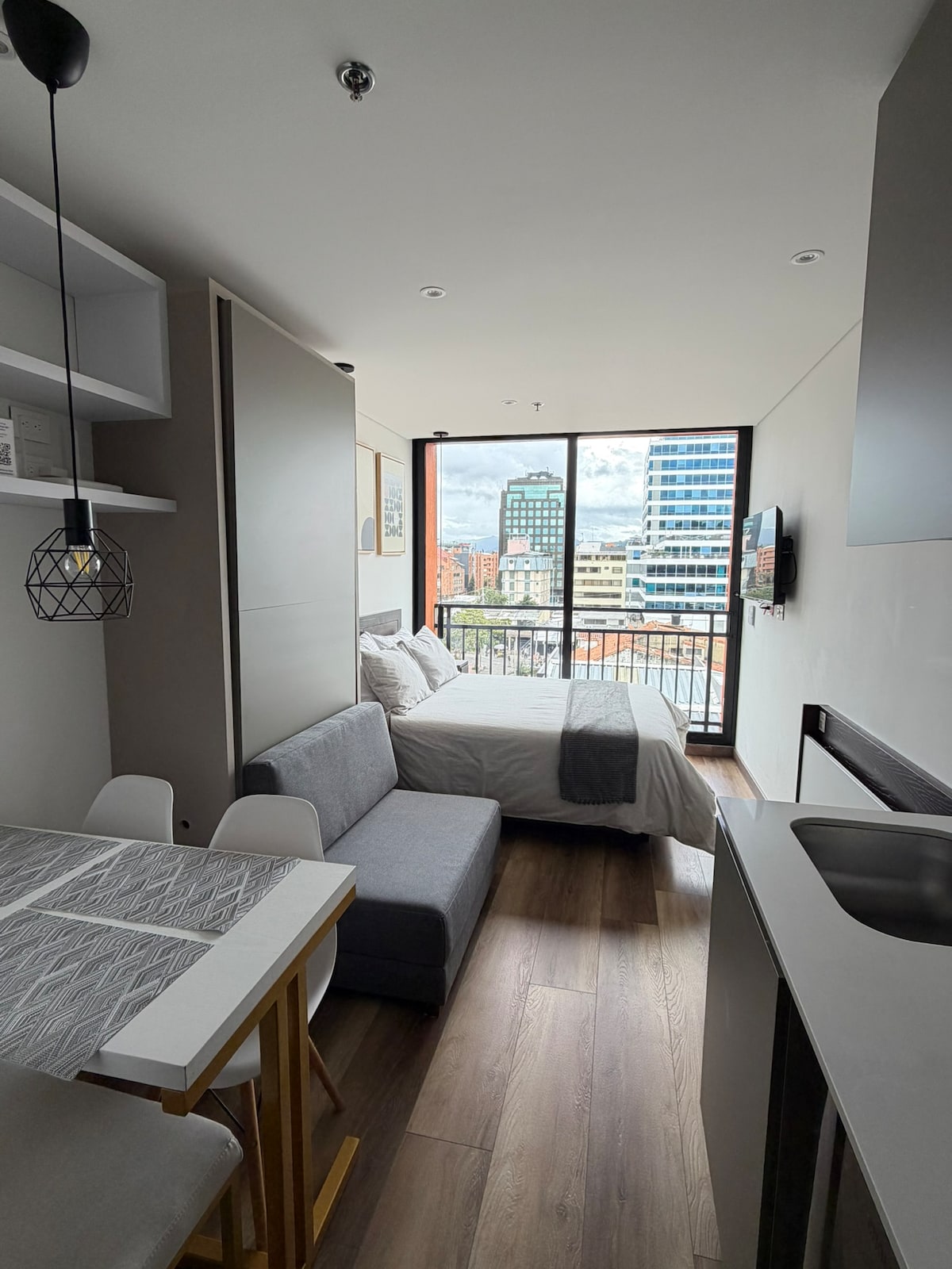 Enjoy a peaceful stay in this charming Bogota studio. It features a double bed and a foldable bed, a private bathroom with a dedicated walk-in shower, and a fully equipped open-plan kitchen to make you feel at home. Includes a private washer-dryer, a dining table for four, and all necessary utensils. Guests have access to premium common areas such as a coworking space, gym, dining zone, billiards, ping-pong, jacuzzi, and a beautiful event lounge. Just a few minutes’ walk from Parque 93