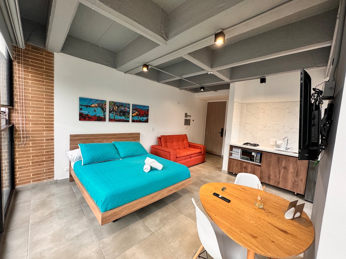 Aparta estudio decorado con estilo y la mejor comodidad para nuestros visitantes. Este alojamiento tiene una ubicación estratégica: en el corazón de modelia, cerca al terminal de transportes, Aeropuerto, supermercados, restaurantes, bancos y la zona rosa. No contamos con elevador. SERVICIOS INCLUIDOS Gym Terraza Área de juegos Desayuno Incluido 7-9am Lunes - Sabado NO Festivos SERVICIOS CON COSTO ADICIONAL Sala de juntas Mini bar 2 parqueaderos cerca. No contamos con convenio
