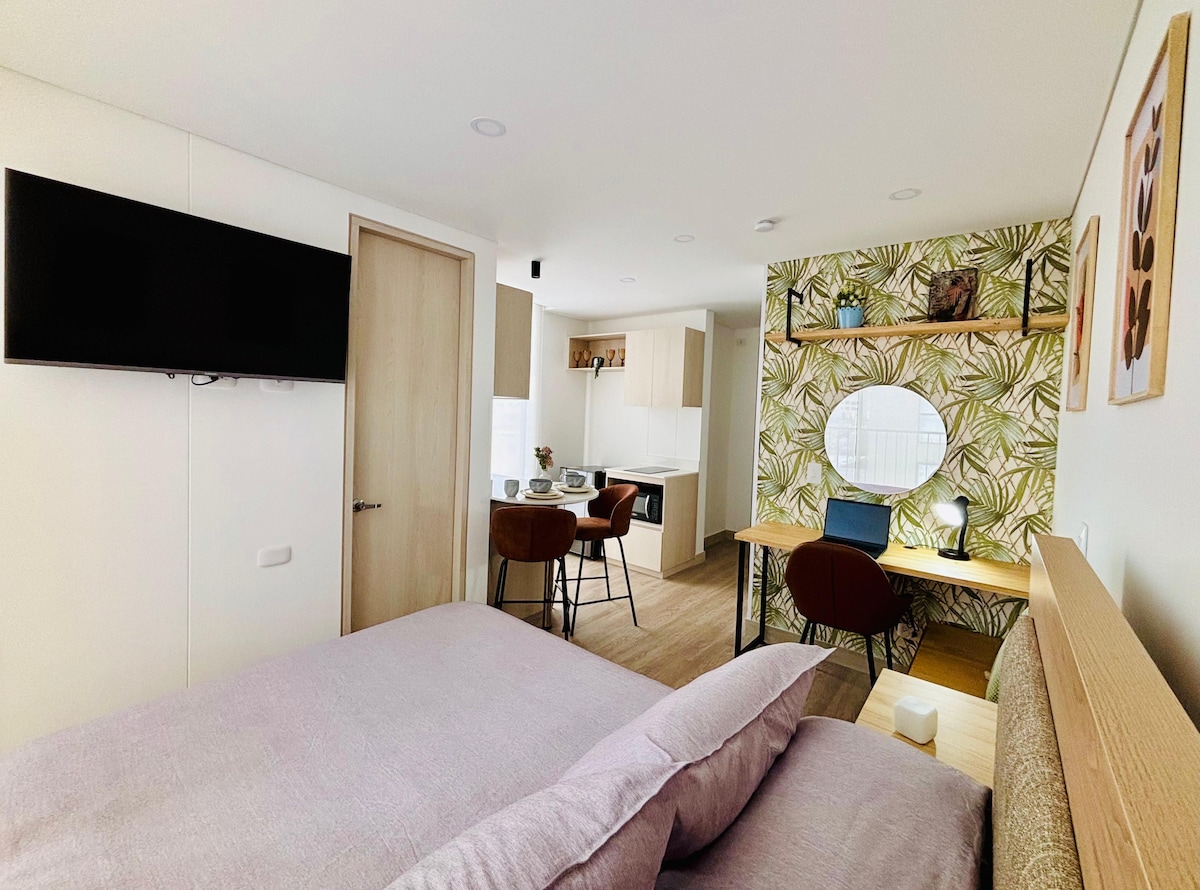Aparta estudio decorado con estilo y la mejor comodidad para nuestros visitantes. Ubicado en el corazón de modelia, cerca al terminal de transportes, Aeropuerto, supermercados, restaurantes, bancos y la zona rosa. No contamos con elevador. SERVICIOS INCLUIDOS Gym Terraza Área de juegos Desayuno Incluido 7-9am Lunes - Sabado NO Domingos ni festivos. SERVICIOS CON COSTO ADICIONAL Sala de juntas Mini bar 2 parqueaderos cerca, ubicados a 2 cuadras del edificio. No contamos con convenio