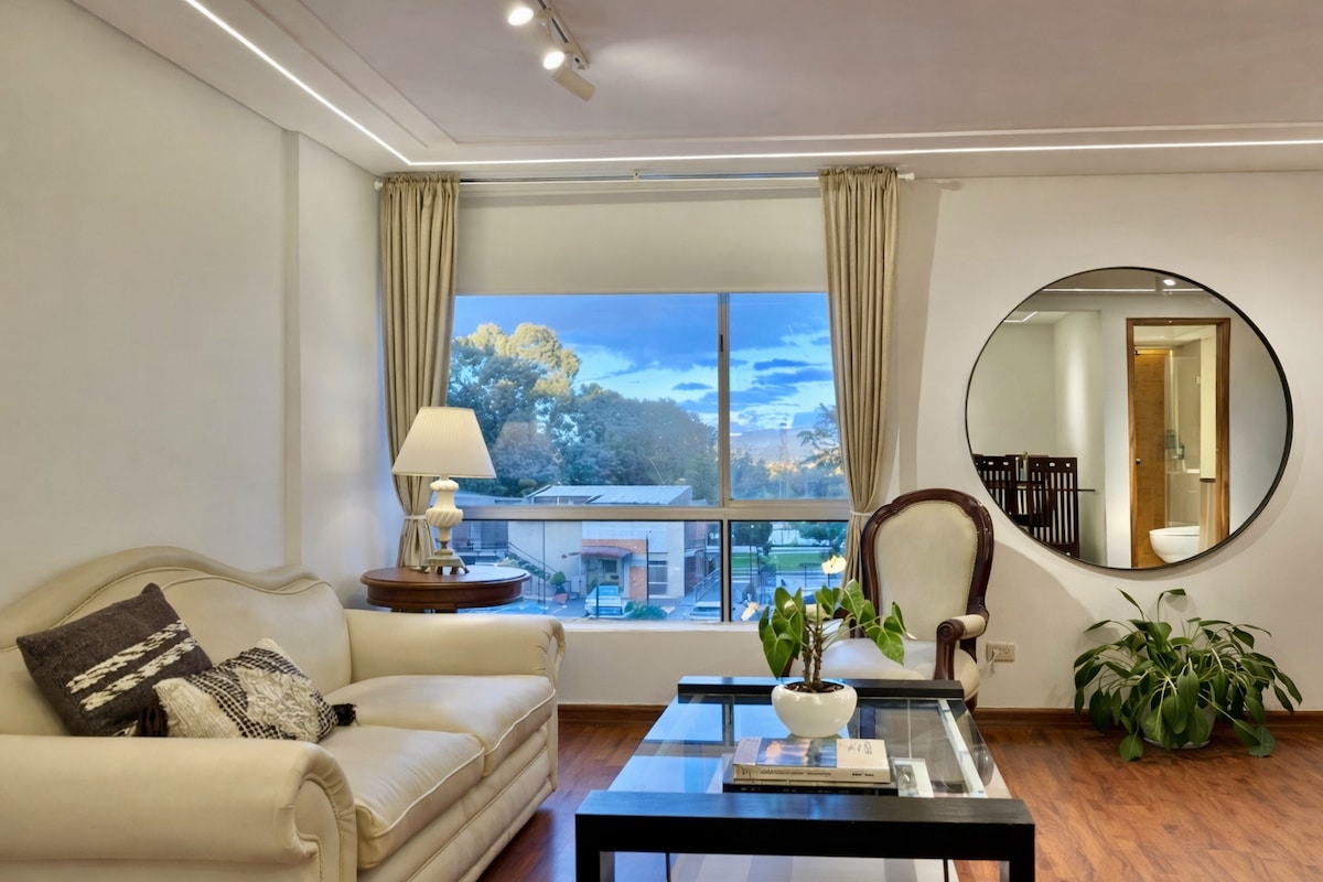 🌆 This accommodation is located in Quinta Camacho, a bohemian and vibrant neighborhood. 🌇 Enjoy the view from the 15th floor balcony and explore nearby restaurants and bars. 🛋️ Quiet and comfortable space to relax. Ideal for couples and solo travelers. 🏙️ 15th floor with spectacular views 🛏️ High-quality hotel-grade mattress 📺 65” TV with Netflix, Prime Video, and Disney+ 🏊 Swimming pool (reservation required), cardio area, game room 🚶 Steps away from Zona T and the financial dist