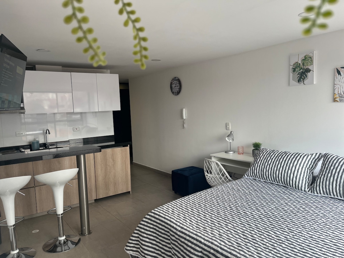 Este lugar tiene una ubicación estratégica: ¡será muy fácil planear tu visita! Aparta estudio totalmente privado. Contamos con vigilancia 24/7, ascensor, terraza con hermosa vista, gran iluminación, internet ilimitado, Smart tv, cómoda cama doble, nevera, cafetera, licuadora y menaje para cocina. Lo necesario para que te sientas pleno y tranquilo. NO CUENTA CON LAVADORA Nos encontramos a 20 minutos del aeropuerto el Dorado, 10 minutos del centro de Bogotá, 5 minutos de Movistar Arena y el Campín