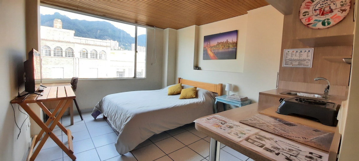 Este lugar tiene una ubicación estratégica: ¡será muy fácil planear tu visita! Habitación con cocina y baño independiente, ubicadísima, excelente espacio y experiencia de alojamiento. Con todo lo necesario para pasar una buena estadía en uno de los lugares estratégicos y centrales de Bogotá. Parques, centros comerciales, restaurantes y excelente acceso a transporte público y avenidas principales. Súper iluminada, tranquila, dotada y con vista a la ciudad. cama semidoble. En 5 piso sin ascensor.