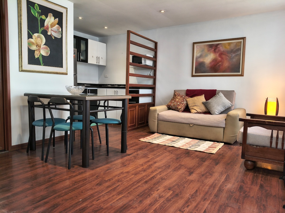 Apartaestudio con baño y cocina privados, full equipada dentro de gran casona, espacios compartidos. Ubicada en el Barrio Belén a tan solo 1km de las aguas y 5 minutos del Chorro de Quevedo, podrás sentir la comodidad de vivir en el último barrio popular y tradicional de la Candelaria que conserva el comercio local y todo lo que necesites a tu alcance. Contamos con dos patios, uno abierto y otro cerrado, baños y cocinas remodeladas, servicio de lavandería y calefacción con un costo adicional.