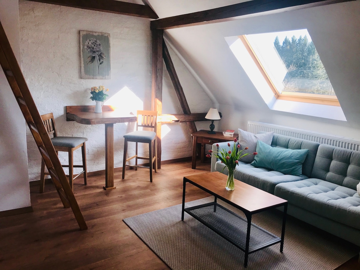 The apartment on the top floor is truly unique. It is located on the second floor and and the entire place has been restored to original building. The original roof wooden frame, exposed brickwork, original flooring, fully functional wooden stove helps you to imagine what people lived like at the beginning of last century. The main living area is facing the front of the house and therefor you will find a view on the town square, town house and the famous basalt rock “Jehla”.