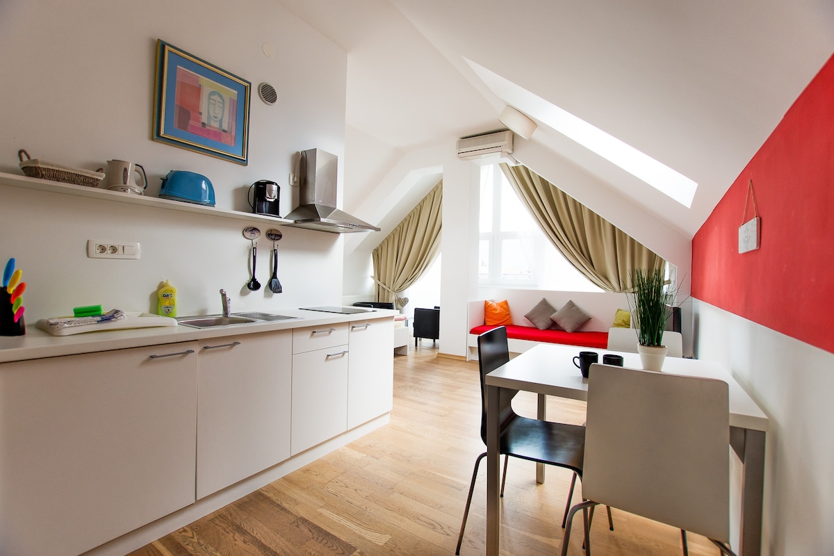 Studio Bela is located in the heart of Radovljica in a peaceful residential area. The studio features a full kitchen with cookware, a coffee maker and kettle. Studio includes driveway parking and a peaceful patio with a view of the forest. Only a 10min walk away from the beautiful old town with cafes, ice cream shops and restaurants. Lake Bled is a 6km bike ride away which offers a picturesque island with a historic church and an old castle atop a high cliff with amazing views.