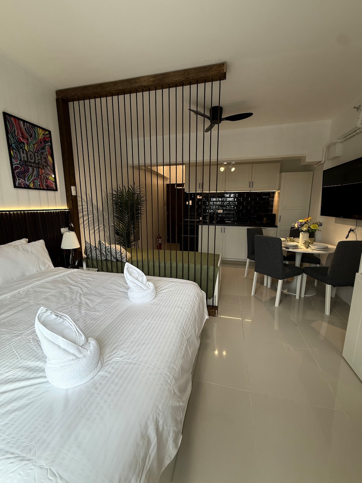 Modern luxury condo in Oceancrest 1, Panglao with full, unobstructed sunset views. Sleeps up to 4 guests with a Luxury queen bed and sofa bed. Enjoy a private balcony, stylish interiors, full kitchen, and resort-style amenities. Only a short drive by scooter or car from white sand beaches, restaurants, and island activities—perfect for couples, friends, or small families seeking a premium getaway.