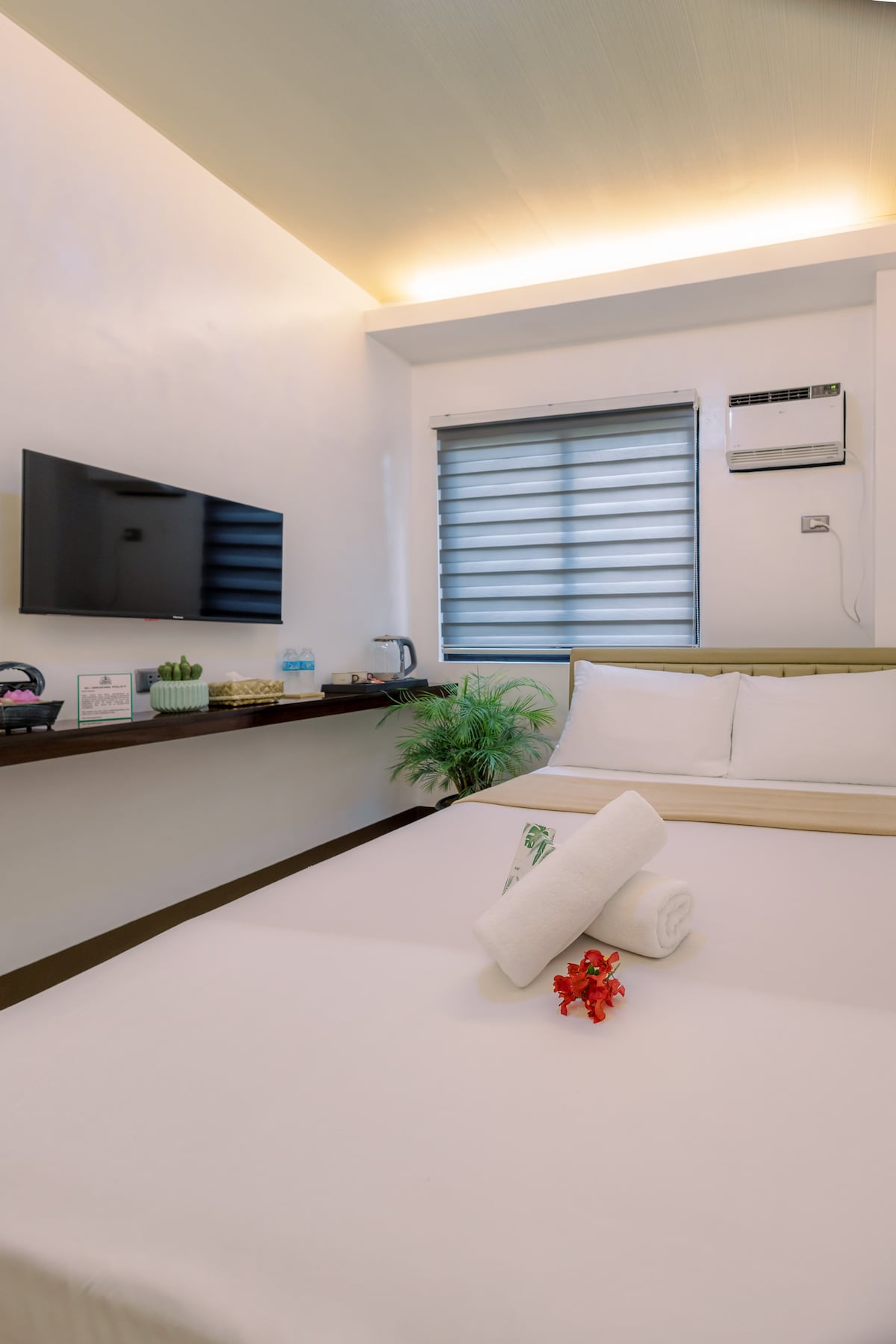 Private rooms with Private bathroom. This room is airconditioned with curtains for privacy. With 1 double bed good for 2 persons. You can also request for 2 twin beds instead. Just let us know in advance or prior to your arrival date. Inside each room, there's a cabinet, a dining table, a sink a bathroom mirror, and a water heater for the shower. You will also be provided with towels. Hot and cold water dispenser in the Reception Area. Free WIFI and pool access as well.