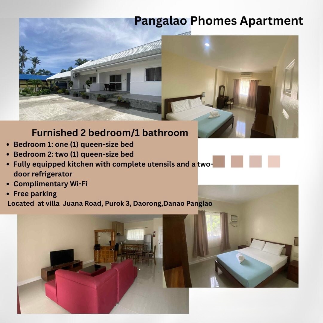 Find your home away from home and relax with the whole family at this peaceful place in the beautiful island paradise of Panglao. Fully furnished with 43" 4k UHD Smart Android TV, wifi, refrigerator, hot &cold shower, kitchen amenities and A/C units. It has a spacious spot outside where you can have your bbq party or have a unique outdoor dining experience. It's a 5-10mins drive away from the Panglao Int'l Airport, beaches, banks and restaurants. Vehicle rental is available upon request.