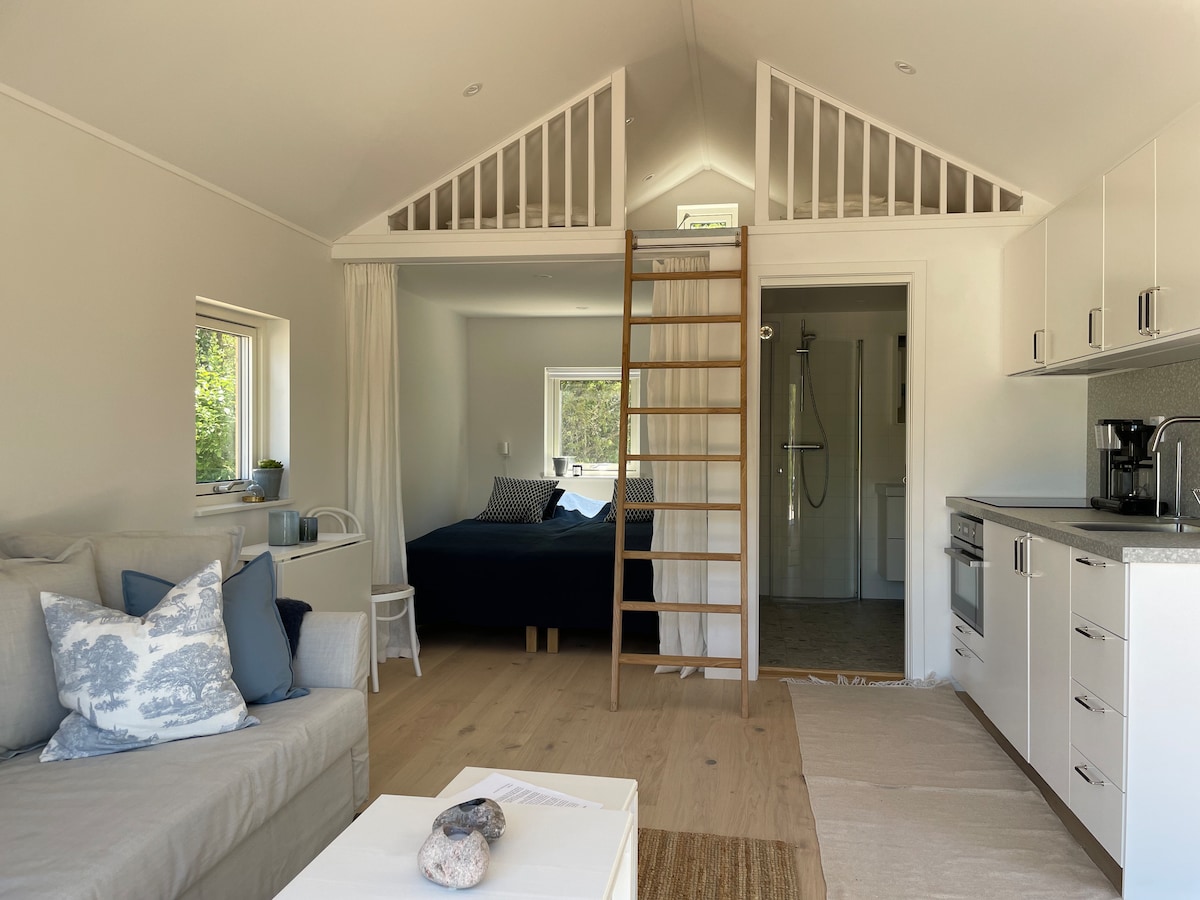 This separate cottage has a view over the sea in a secluded, beautiful countryside setting, still just 5 mins from the E6 motorway. It is recently completely refurbished keeping the old style. On first floor a living room with a cosy fire place (iron stove), a bathroom with toilet, shower and underfloor heating, a small but fully equipped kitchen, and a dining room with doors to the terrace. On second floor it is an open loft with limited height functioning as a bedroom with 4 beds in total.