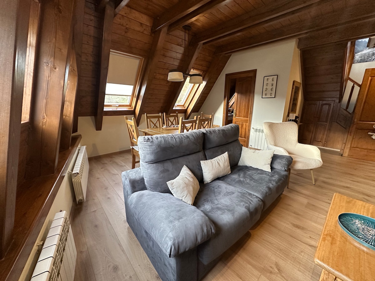 Ven a disfrutar y a relajarte en mi acogedor ático dúplex con vistas a Vielha y a sus espectaculares montañas. Se ubica a 8 minutos de Vielha caminando y 2 minutos en coche, el ático no dispone de parking, aunque en los alrededores es fácil aparcar gratuito. El apartamento es muy luminoso, dispone de dos habitaciones con baño completo cada una, cocina equipada, comedor con sofá-cama y chimenea de leña.Es una zona muy tranquila, ya que la casa solo se compone de dos pisos.Dispone de Wifi.