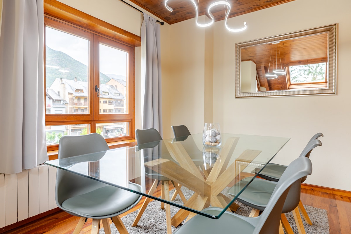 Con maravillosas vistas, este luminoso apartamento se encuentra en el valle de Benasque, perfecto para descansar, para caminar por senderos infinitos . El valle ofrece gran cantidad de deportes y actividades como escalada, rafting, parapente , esquí alpino, de fondo, raquetas, y otras muchas actividades, sin olvidarnos de su gastronomía caracterizada por la utilización de productos de la tierra, uniendo tradición e innovación para incorporar a esa cocina tradicional, cocina de vanguardia.