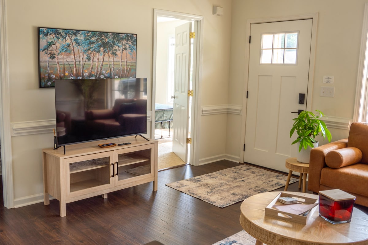 Visit TIEC (5mi) and NC foothills in a modern and cozy studio that sleeps up to 3 adults (or 2 adults and 2 children). The cottage features a recently renovated interior with queen bed, sleeper sofa, luxury linens, well equipped full size kitchen & laundry. Private fenced yard with sitting area, chiminea, and gas grill. Super fast, reliable wifi perfect for working or streaming your favorite shows. Centrally located, 5 miles to TIEC. Close to many wineries, hiking, and antique shops.