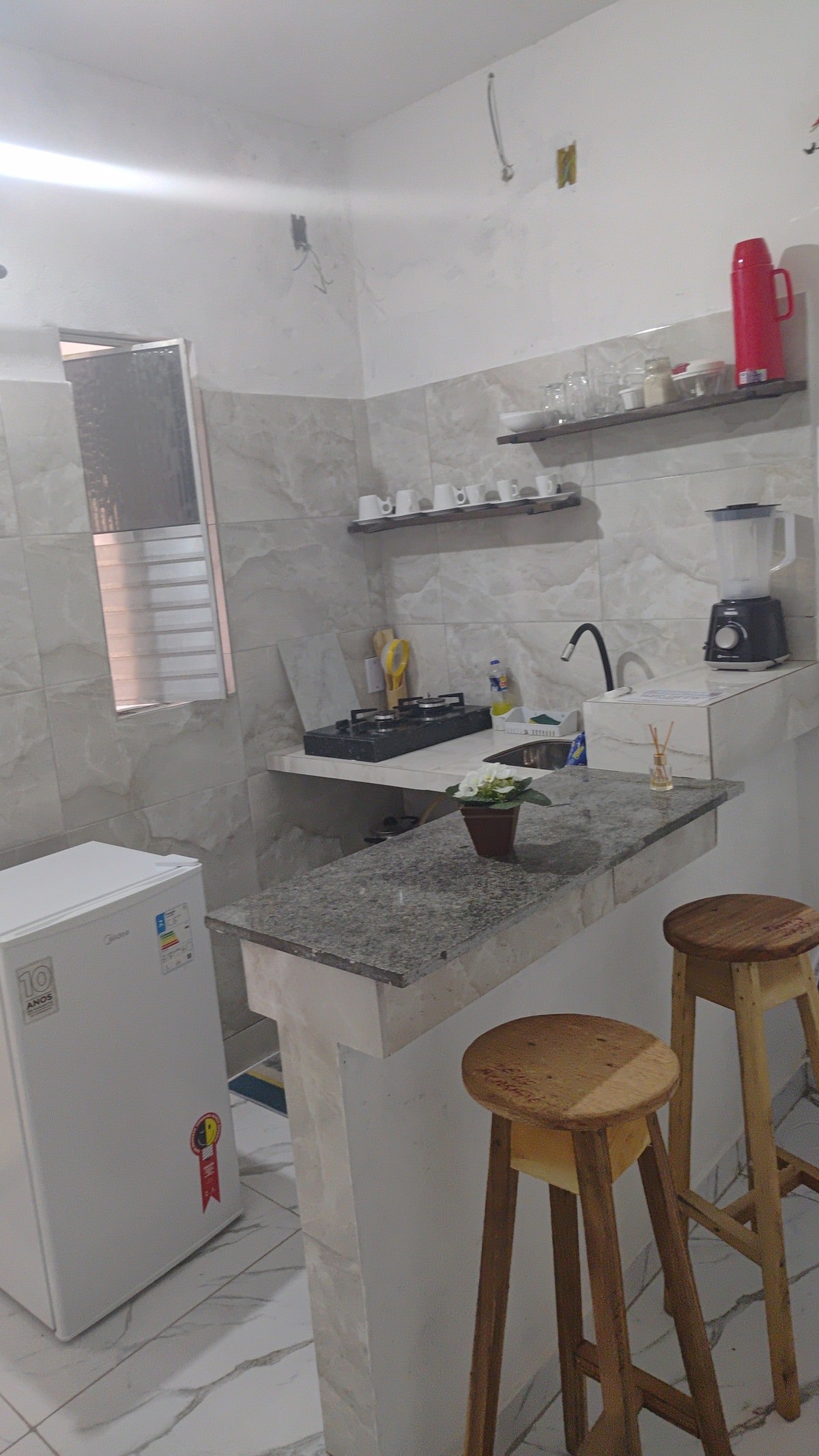 Leia o anúncio antes de fechar. Acomodação no 1º andar. Kitnet compacto com 4 camas de solteiro ou uma de casal grande e duas de solteiro Ortobom. Oferecemos roupas de cama e banho, não trocamos elas durante a estadia. Utensílios domésticos básicos, garrafa térmica, panelas, talheres, micro- ondas, geladeira e sanduicheira, liquidificador.