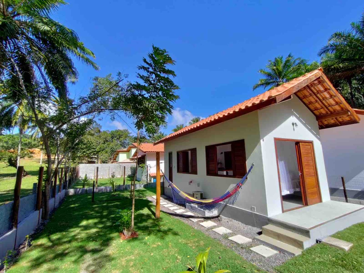 Casinha com mezanino, aconchegante e completa. Um espaço pensado para o seu descanso, conforto e bem-estar. A casa tem 1 quarto com cama de casal e ar-condicionado, mezanino com cama de casal e ar-condicionado, banheiro com chuveiro elétrico e cozinha completa com balcão americano. A varanda é um convite para relaxar: rede, churrasqueira, chuveirão e mesa com ombrelone para aproveitar bons momentos ao ar livre. Aqui, você se sente em casa desde a chegada. Relaxe, desacelere e VIVA Boipeba!