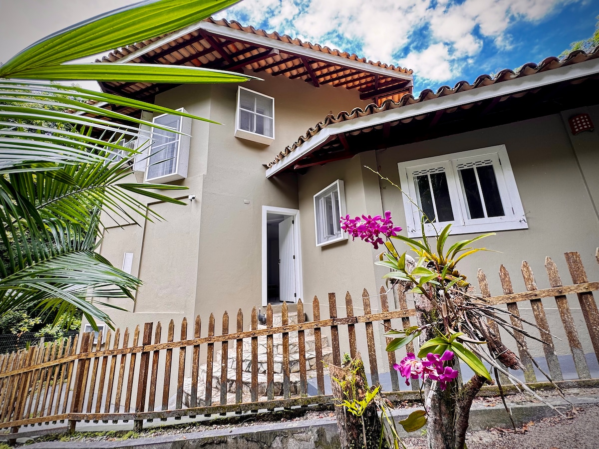 Casa aislada de 70 m2, totalmente equipada, entrada independiente, dentro de un área verde de 1.500 m2. Dos dormitorios, un baño, sala, cocina americana, terraza, zona de lavado. A 10 minutos caminando o a 3 minutos en cuadriciclo de las hermosas playas de Tassimirim y Cueira, 5 minutos caminando al centro de la Vilha, comercio en general, restoranes, puesto de salud y a 200 metros del punto de tractor y cuadriciclos. Smart TV, wifi y aire acondicionado. Ideal para trabajo a distancia.