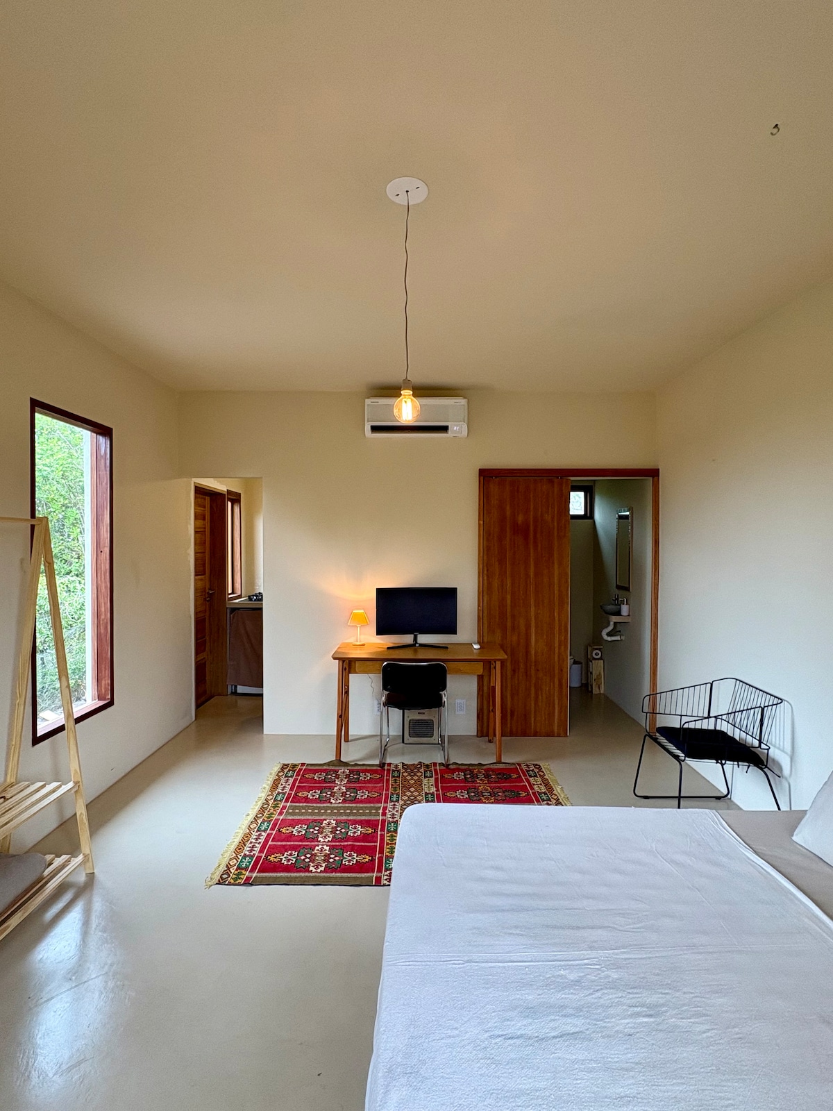 Nestled on the island of Boipeba above the charming village of Moreré, this beautifully designed studio offers a rare sense of calm and comfort. Soundproofed windows and doors create a super quiet, peaceful atmosphere inside while ocean views can be enjoyed from the window and the private garden. The modern, minimalist architecture blends seamlessly with nature and features an eco-friendly rainwater harvesting system, along with high-pressure indoor and outdoor showers and well equipped kitchen.