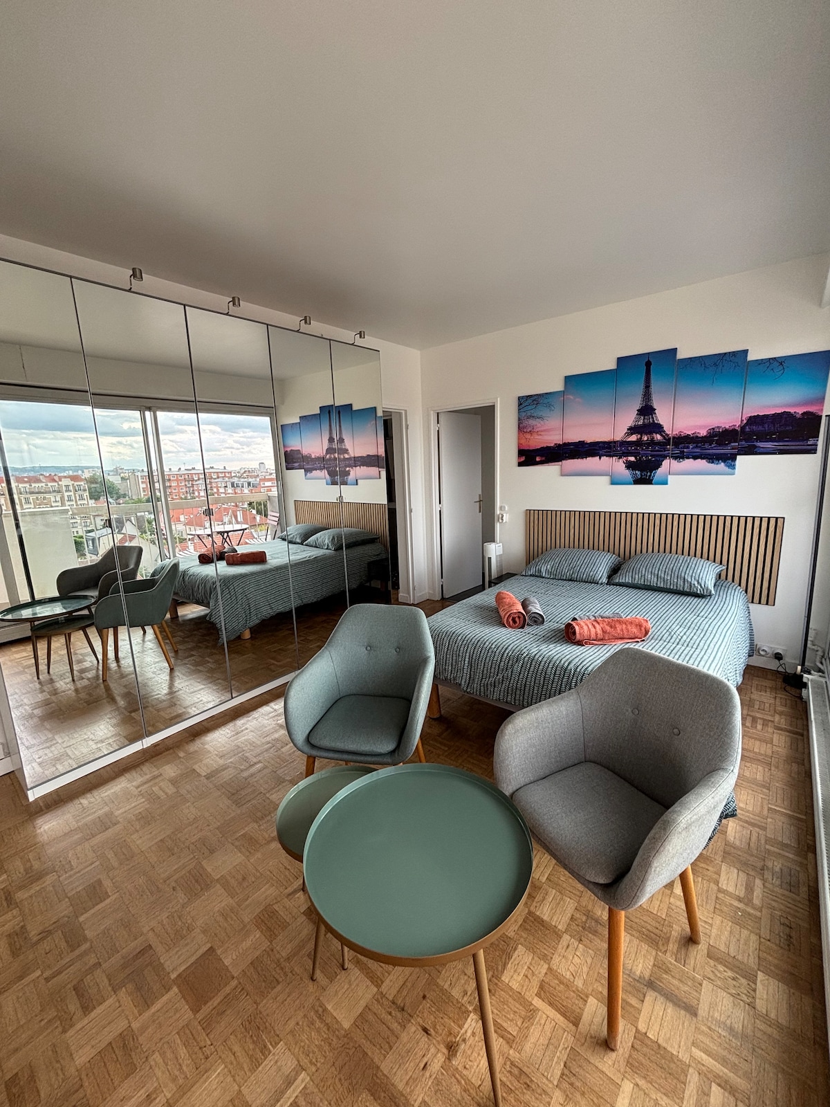Picture this… You climb the stairs of a quintessential Parisian building (2nd floor, no elevator, just 4 apartments), key in hand, ready to step into your cozy 409 sq ft nest for the next few days. The moment you walk in, a wave of serenity washes over you every detail is designed so you feel right at home, instantly. It’s the perfect starting point to explore Paris and its suburbs: just a 2-minute walk from the train station, and you’ll effortlessly reach the city center and La Défense.