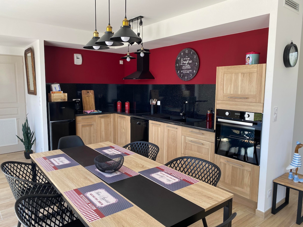 Maison proche de la plage à 300m Maison tout confort .chambre avec tv Toilette indépendante. Salle de bain avec lave linge Salle à manger avec canapé lit 2 personnes Cuisine avec lave vaisselle. Four micro-ondes. Cafetière bouilloire. Grille pain .et tout le nécessaire de cuisine..Petit jardin avec salon de jardin .parasol et transats la maison ne fournis pas le linge de maison .le menage doit fait au depart