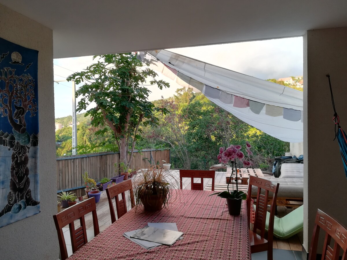 Studio de 21 m² environ a l'étage 12 marches, dans la maison du propriétaire, un parking gratuit fermer a clef et éclairer la nuit, une varangue vous attend avec un barbecue pour les grillades, table et 2 chaises, si vous fumer , un cendrier vous est fourni seulement a cette endroit . Selon saison le bananier, manguier, le cotonnier, le papayer et bien sur la piscine toute l'année t° 23 minimum l' hiver et 32° l été, Nous vous laissons la priorité a la piscine .