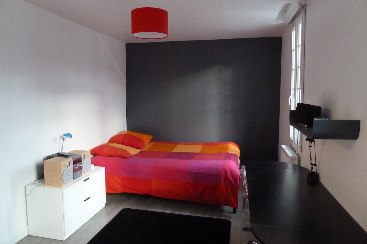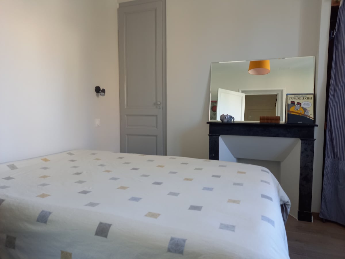 Duplex rénové, attenant à la maison des hôtes, avec une magnifique vigne vierge sur la façade, comprenant : - une cuisine tout équipée pour 2 personnes (Nespresso, Tassimo et cafetière filtre a disposition) - une chambre avec un lit double 140, et un canapé fixe (non convertible), un coin bureau et TV. - une salle de bain avec baignoire et douche. Proche tous commerces (à pied) : bar/tabac, épicerie, boulangerie, supermarché, restaurants, cinéma, bowling.
