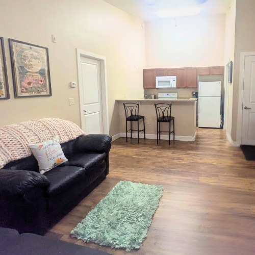 * Casita attached to new home -- No stairs * Private patio * King size bed for 2 adults, bed-side lamps with charging options & outlets, full length mirror & large dresser * Couch, tri-fold memory foam mattress, pac-n-play, & air mattress available, for up to 2 more adults in the living room * 100 MBS Wi-Fi, Smart TV * Keurig with pods: DECAF, regular, tea, cocoa * Small fridge/freezer, microwave, electric tea kettle * Deluxe shower wand, blow dryer * Double closet, iron & ironing board