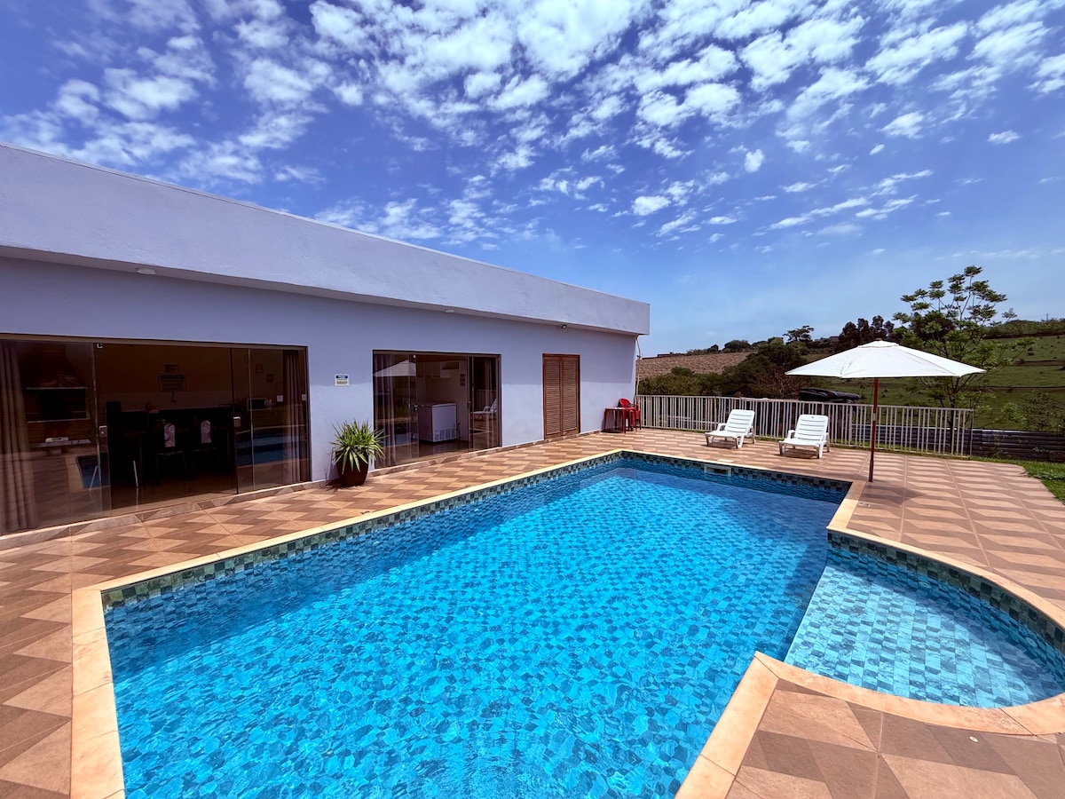 The property covers 5,000 sqm, with a pool near the barbecue area, sports court, and a complete game room (billiards, foosball, table tennis, video games, and card table). It offers mesh Wi-Fi with 600 Mbps fiber internet, satellite TV, a single-floor layout, flat terrain, a kid's playground, and numerous communal spaces, both indoors and outdoors! Located just 1 hour from São Paulo! The house is a mere 10-minute drive from the city center and the Skydiving and Ballooning Center.