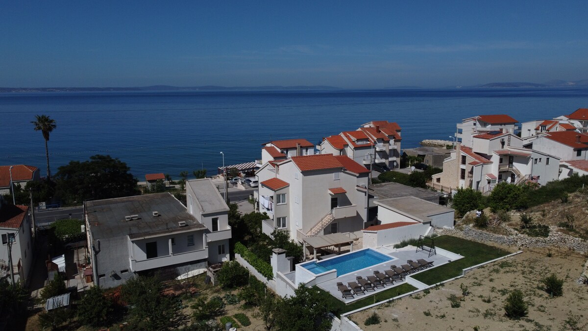 Novoizgrađena i moderna Villa ASTERA (cijeli prostor) je smještaj s predivnim pogledom na more i otok Brač s privatnim bazenom, vanjskom blagavaonicom i sjedećom garniturom, ležaljkama uz bazen, kompletno opremljena kuhinja, 1 dnevni boravak, 5 spavaćih soba i 3 kupaonice, vanjskim roštiljem, sunčalištem, potpuno opremljena za ugodan boravak.