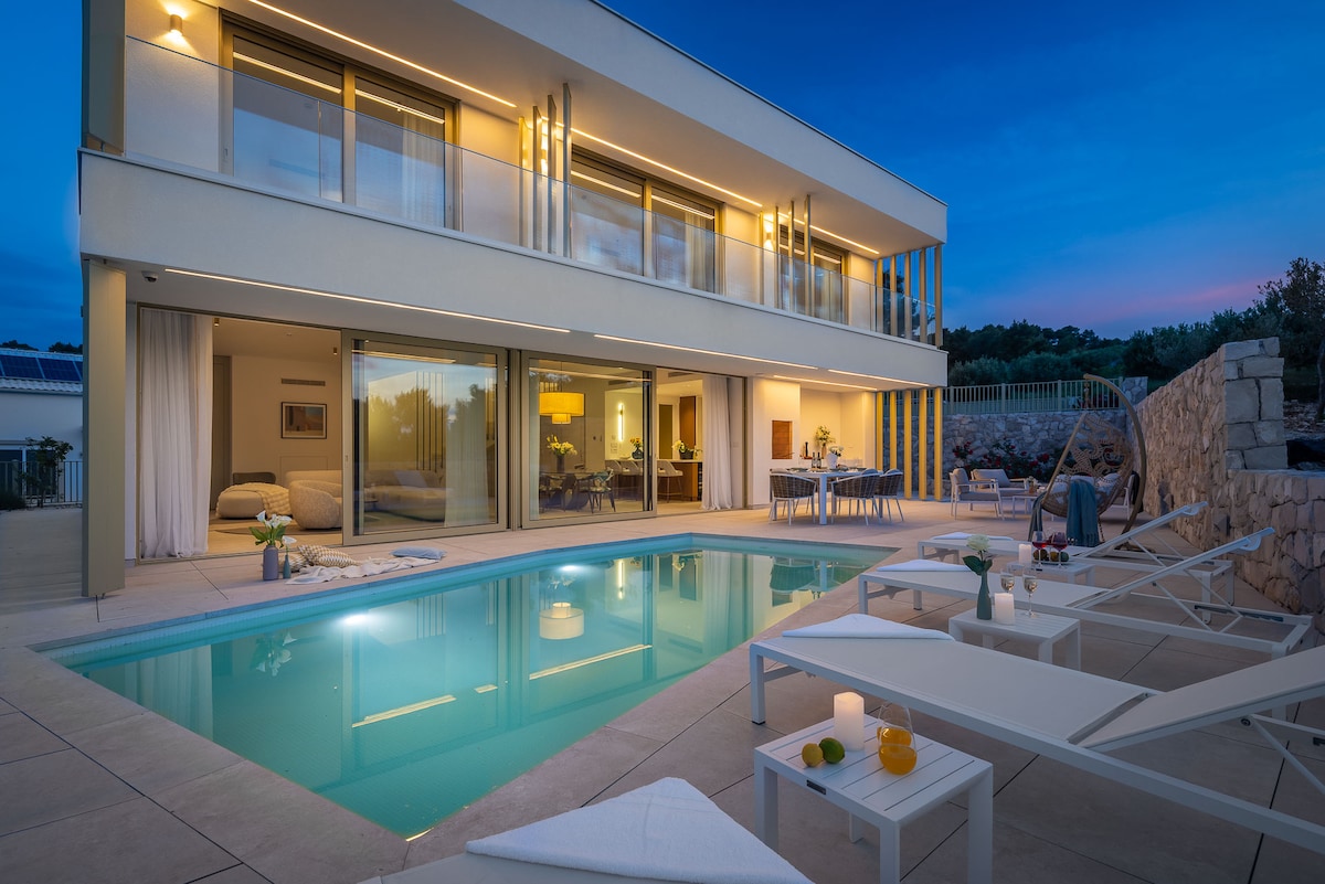 Our brand new luxury villa Luka is located on a wonderful location with beautiful sights and yet still very close to the all local points of interest. The villa is newly built for maximum comfort and luxury with 3 ensuite bedrooms (and an extra room in case of need) and all other amenities you can need. A big private, heated pool with wonderful views, great indoor jacuzzi in spa area with an sauna and gaming/billiard room, a nice fenced outdoor area with a table tennis, badminton or archery set.