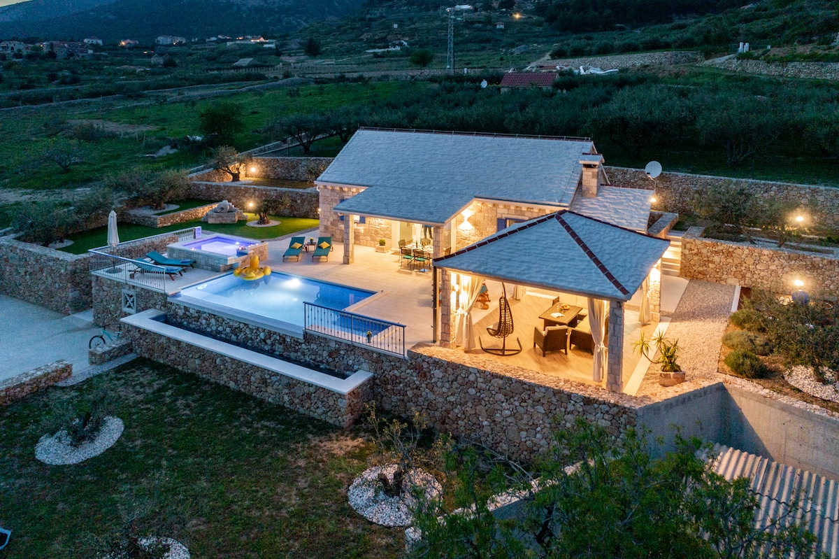 We are delighted to offer one of the most unique accommodations in Croatia, in the abandoned eco-ethno village of Humac. Villa dates back to 1880, and it was completely renovated in 2020. The estate consists of a traditional Mediterranean stone house of 160 m2 and a unique garden of 3000m2 fields of lavender and immortelle that provides complete privacy and peace. g This is a fully equipped 4 bedrooms and 5 bathrooms villa with a large terrace with hot tub and amazing sunset views