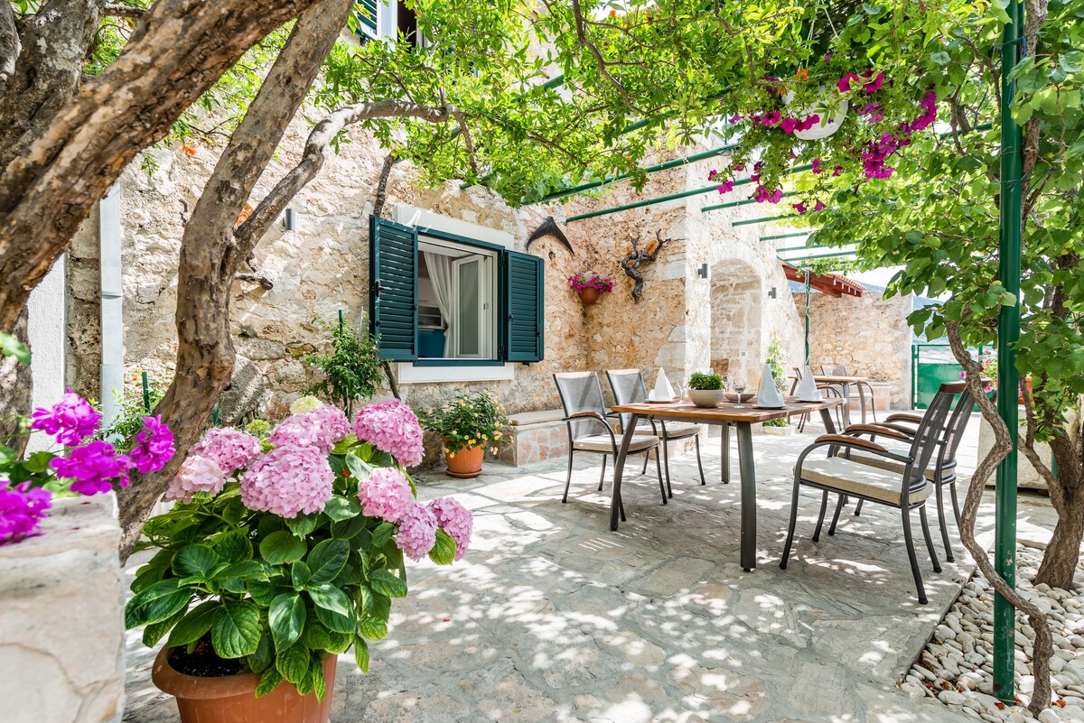 Two-floor stone house, with a sleeping room, living room, dining area, bathroom, and kitchen. It was built originally in 1711., it's in the center of Jelsa. It has all the modern amenities: air conditioning, TV, washing machine, equipped kitchen and bathroom, and a small library. Also, our guests receive a welcoming bottle of homemade wine and olive oil. It's no more than 100 meters from the sea. A small terrasse, overlooking our garden, is perfect to enjoy your coffee or a glass of wine.