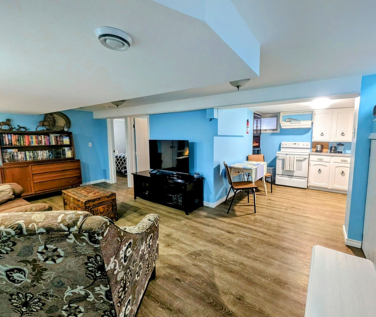 We've recently renovated our basement to create a stylish, modern, cozy and quiet guest suite. There is a side entrance that opens directly onto stairs taking you down to the unit. It has a locking metal exterior door for sound-proofing and security. The unit is a bright studio apartment with three large windows, a full kitchen, sitting area with tv and fireplace, dining table, queen-sized bed, walk-in closet and your own private bathroom with a five-foot shower. With extensive sound-proofing!