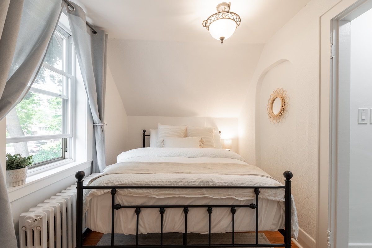 Enjoy your experience at this centrally located and charming one bedroom apartment in a historical century home. This tastefully renovated unit is spacious, equipped with a full kitchen, and dedicated workspace in the large bedroom. Conveniently features unlimited high speed internet, Smart TV, and secure keyless entry. Parking available at the back for 1 vehicle. The bedroom features a comfortable king sized bed, dedicated workspace, and room darkening shades.