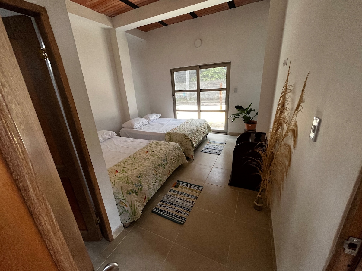 Habitación ideal para familias o grupos pequeños. Cuenta con una cómoda cama doble y una cama auxiliar individual, perfecta para un tercer huésped. Espacio moderno, con aire acondicionado, baño privado y todo lo necesario para una estadía confortable.