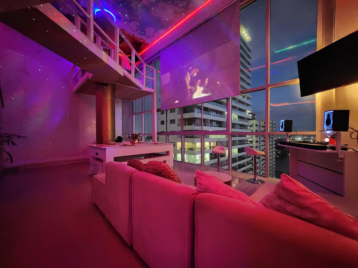 This exclusive duplex offers a one of a kind luxury experience in Cartagena. Just 5 minutes from the airport and close to the historic center, it has a jacuzzi in the room with panoramic view, pool table, Balcony pin pon, and video game machine. In addition, its projector will allow you to enjoy movies on a giant screen. Private balcony, outdoor shower. Every detail is designed to provide you an indulgent and luxurious stay, combining comfort and entertainment in one place.