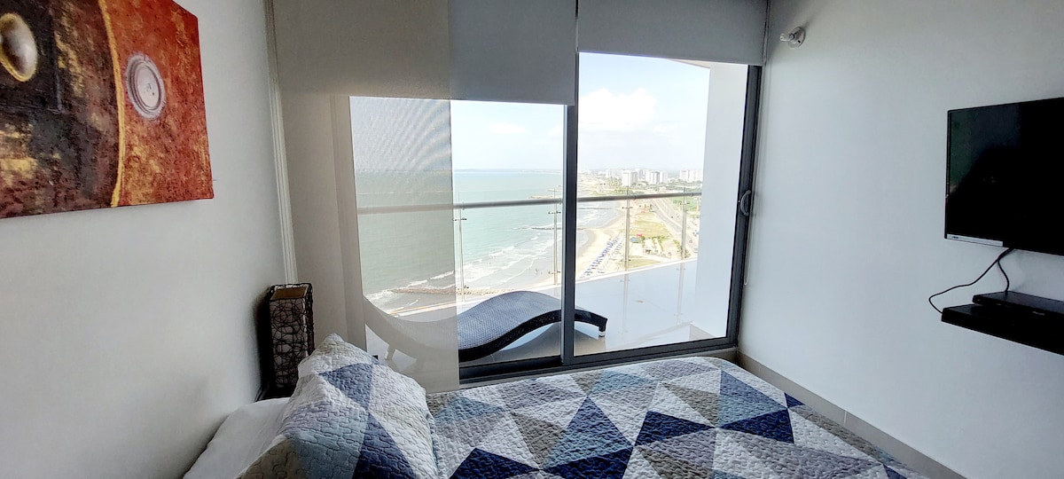 One of the best buildings and locations in Cartagena. Beachfront 1 BR apartment with sea view from any spot. Located on the Morros City Building in Bocagrande. Next to restaurants, shopping areas, banks, grocery markets, ATMs, and shopping malls. Just a 10 minute drive to the Old City, a Unesco World heritage place. The building has many amenities to enjoy, Spectacular Beachfront Swimming pool, Cabanas, hot tub, Gym, 24/7 Security *The building does not allow visitors, only registered guests