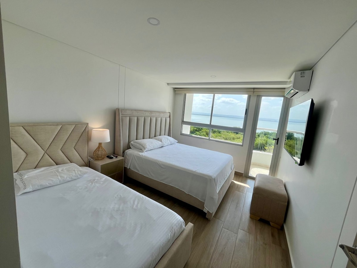 ✨ Welcome to your retreat in Cartagena: a luxury high-floor apartment facing the sea, with two private balconies and a 180° panoramic view of the Caribbean and the bay. Designed for your comfort, it features a modern living room with floor-to-ceiling windows, a fully equipped kitchen, fast WiFi, and digital check-in. Enjoy the infinity pool, poolside bar, and ocean-view gym. Located in Bocagrande, steps from the beach and minutes from the Walled City. 🌊🌴