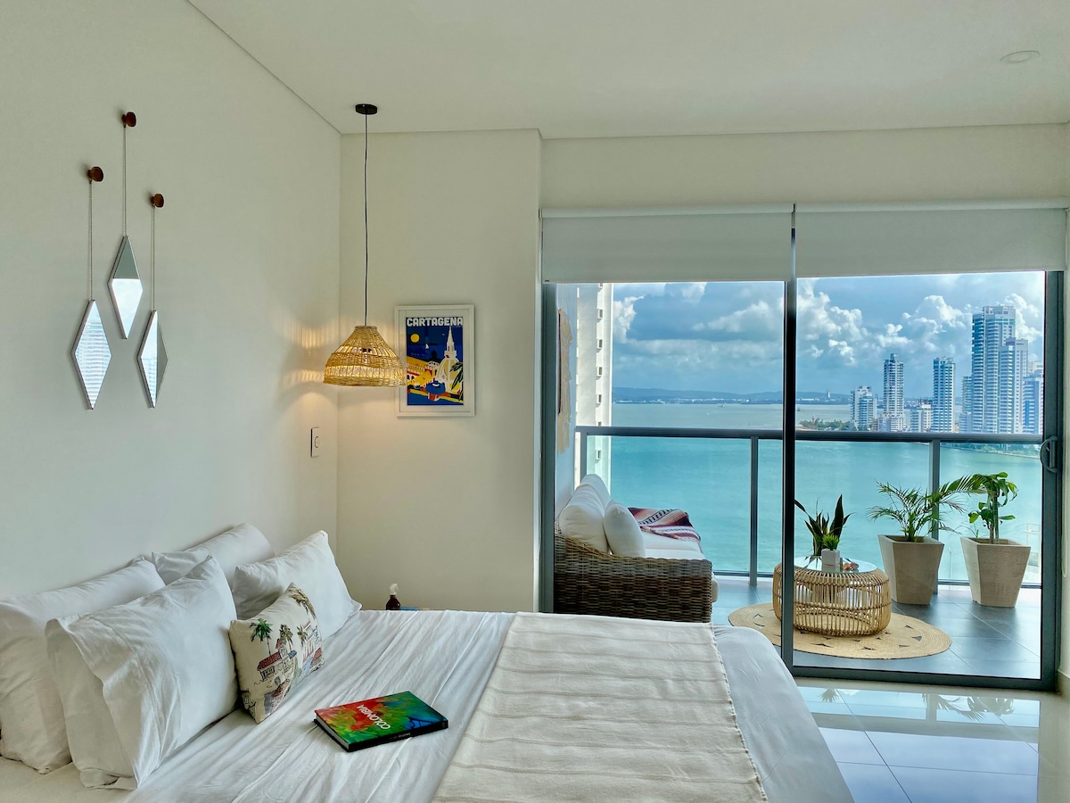 This apartment is perfect for couples looking for an exclusive place to stay, with everything within reach. It’s also suitable for older guests. The building is a residential tower located above a shopping center that has it all — supermarkets, restaurants, and stores. The apartment itself has an elegant style, thoughtfully designed down to the smallest detail. It's filled with Cartagena-inspired art and offers a spectacular view.