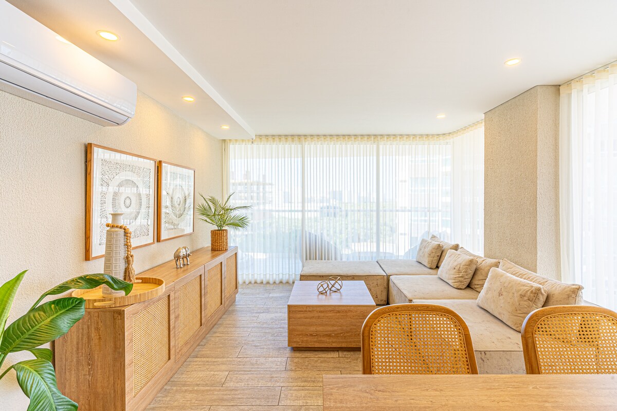 Exclusivo Apartamento en el sector de Cielo Mar de Cartagena. A 10 minutos del aeropuerto y a 3 cuadras de la playa, cerca hotel Las Americas. Capacidad para maximo 3 personas. Un espacio acogedor, con decoración minimalista, elegante y luminoso. Podrás disfrutar del jacuzzi al interior del apto y las zonas húmedas del edificio.