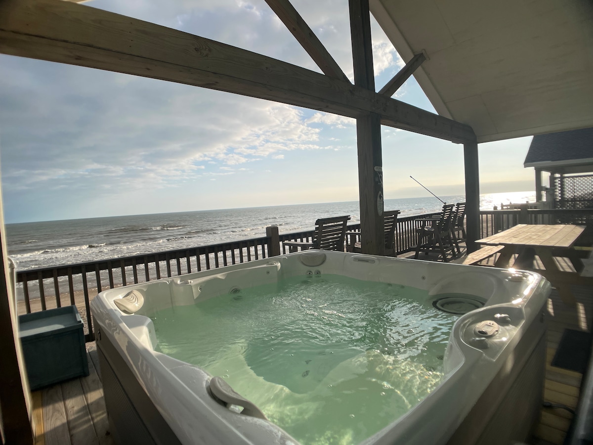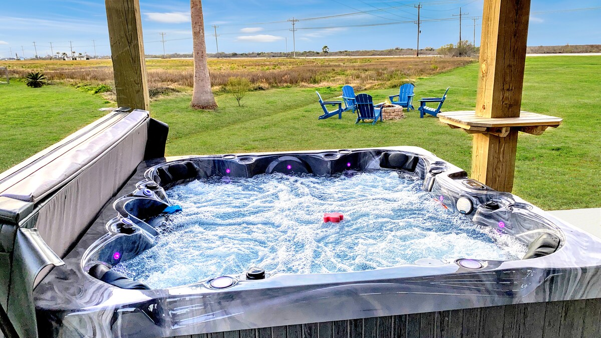 • Hot tub, outdoor putting green & game room with ping pong, foosball & darts! • Amazing 2nd floor wraparound deck space with 270° views • Gorgeous outdoor tiki bar, fire pit, hammocks & more! This home is centrally located in Crystal Beach with shops and restaurants just a 2 min drive away! Or, you can stay home & sip coffee & beach views on the back porch The trendy, fully stocked kitchen has a full coffee bar & is ready for you to enjoy a meal or drinks with friends & family