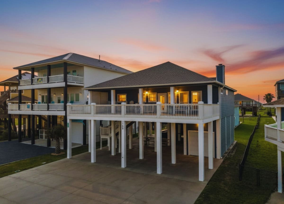 Unobstructed ocean views! See all the way down the beach to Galveston. Four bedrooms and 3 1/2 baths. Plenty of space and several decks for enjoying the sun. You have space to entertain, inside the beach home , but also underneath where you will find a large built in bar, propane/charcoal bar b q , swings, hammock loft and outdoor shower. Fenced in yard. Private walkover to the beach. Gourmet kitchen with butlers pantry. Tv's in every room. Master has soaking tub with beach view! Sleeps 14