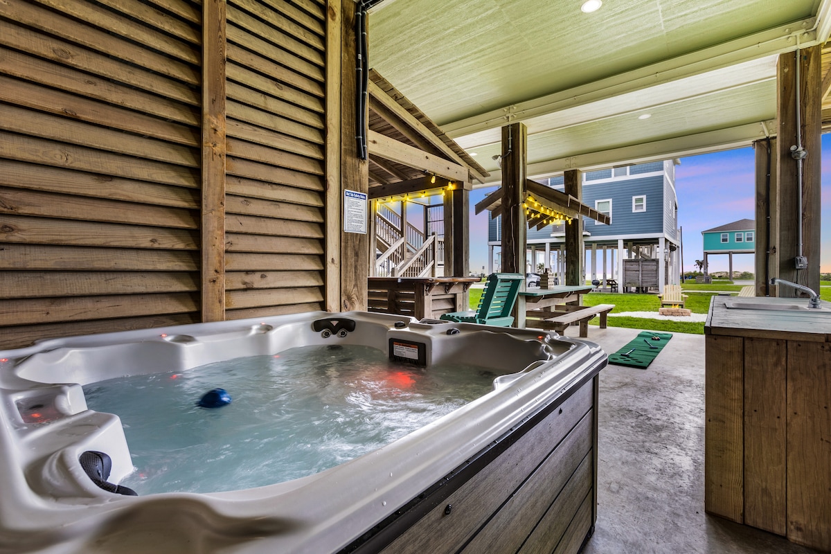 • Hot tub, outdoor putting green & game room with ping pong, foosball & darts! • Amazing 2nd floor wraparound deck space with 270° views • Gorgeous outdoor tiki bar, fire pit, hammocks & more! This home is centrally located in Crystal Beach with shops and restaurants just a 2-min drive away! Or, you can stay home & sip coffee & beach views on the back porch The trendy, fully stocked kitchen has a full coffee bar & is ready for you to enjoy a meal or drinks with friends & family