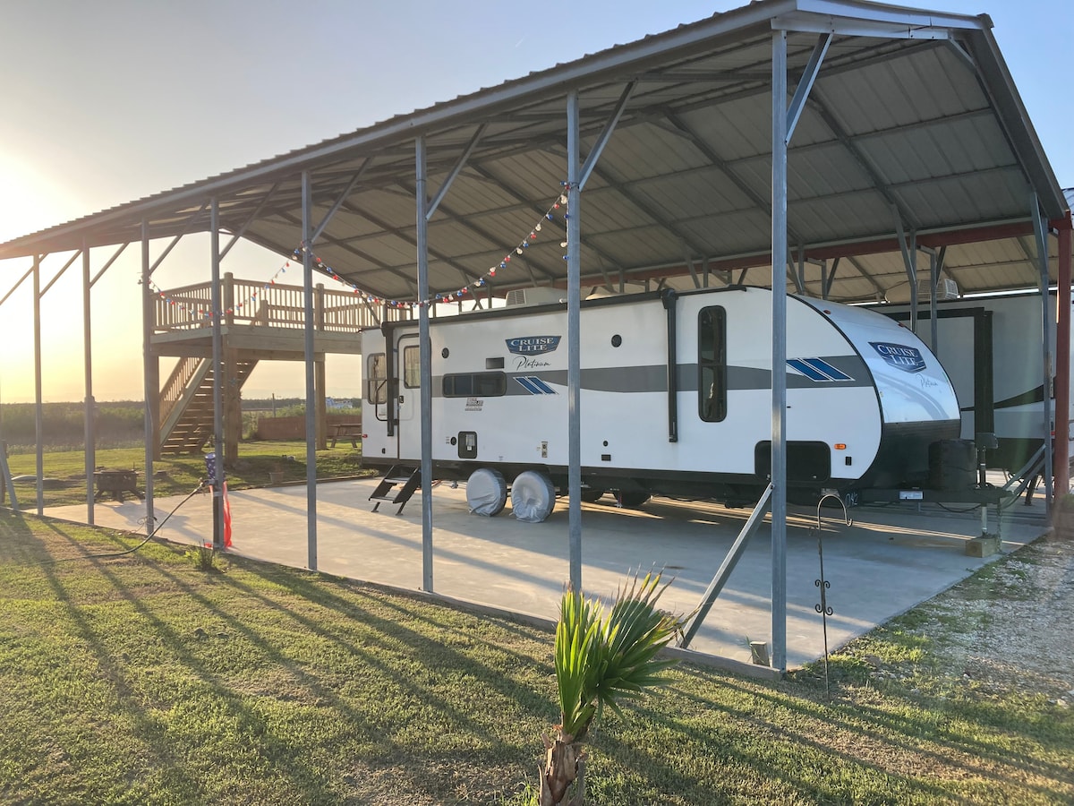 Beautiful new camper. Very clean. Large cover over camper and large concrete pad. The cover will provide some relief during the Texas heat and a cover for any rain. Fish and crab right out the back door.There is a brand new 10 x 16 and 10 foot high deck to go out on and watch the barges, pelicans,shore birds and the sunsets! The site has a fire pit with a grill on top of it to cook on. Pull your boat up to the back of the campy.Queen size bed when you are ready to turn in!