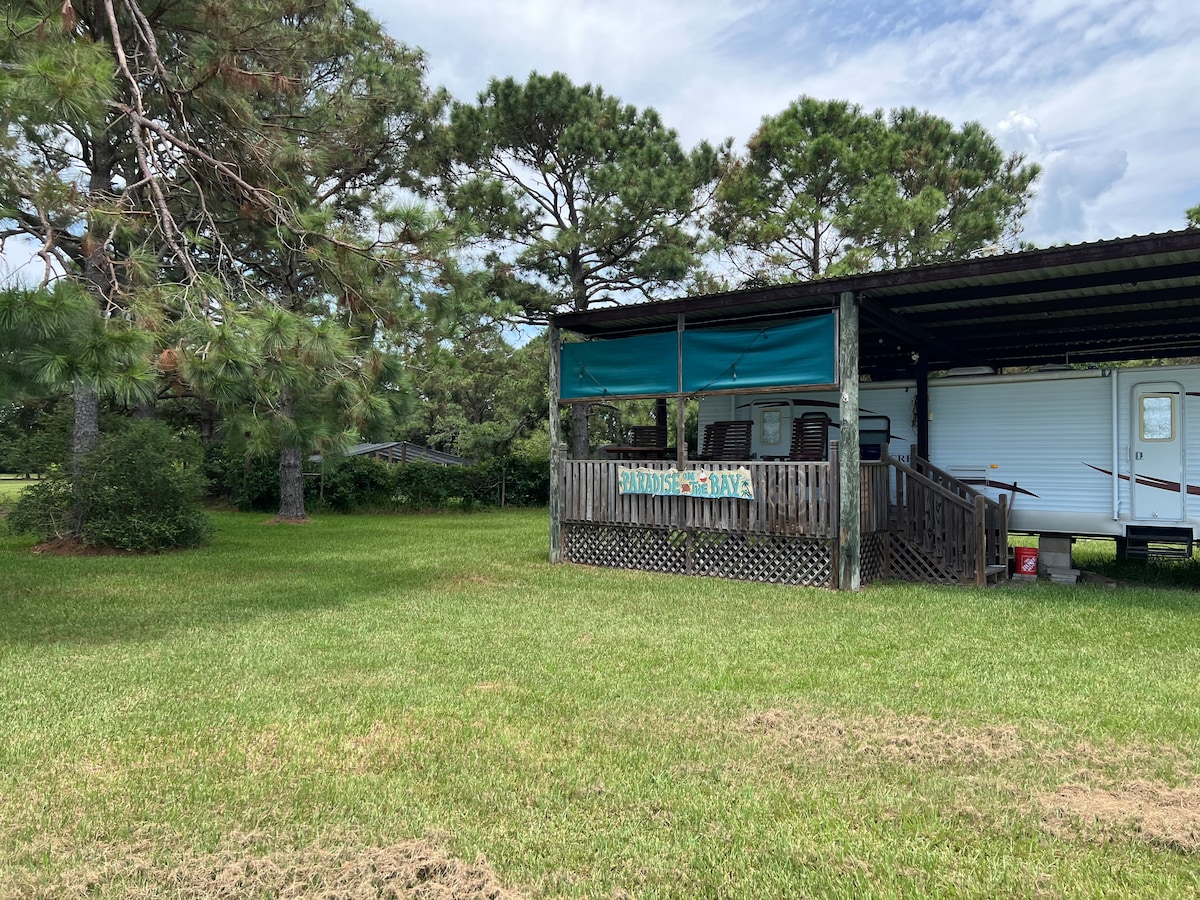 Enjoy your beach getaway with a large covered deck, hammock, grill and picnic table. Includes roomy Travel trailer with Queen master bed, a large couch that makes into a bed if needed, another couch that also can make into a bed and bunk beds in the back. Also full kitchen and bathroom with tub and shower. Free Wi-Fi. We also offer golf cart rentals
