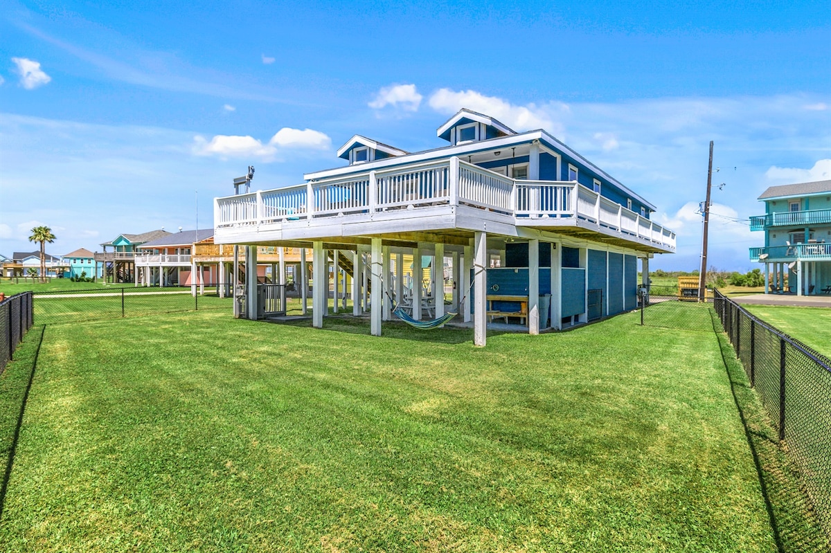 Come away to this amazing beach house in Crystal Beach with water views and walking distance to the beach. Outside, the property is all about lounging and entertainment, with a fire pit, hammocks, shady porches, sweeping balconies, a weber grill, and a ping pong table. Inside, you'll find 4 gorgeous bedrooms with a bonus kid-friendly sleeping nook, a spacious living area with fire place, and a well-stocked kitchen, perfect for families, friends, or couples. 5 min walk to the Beach