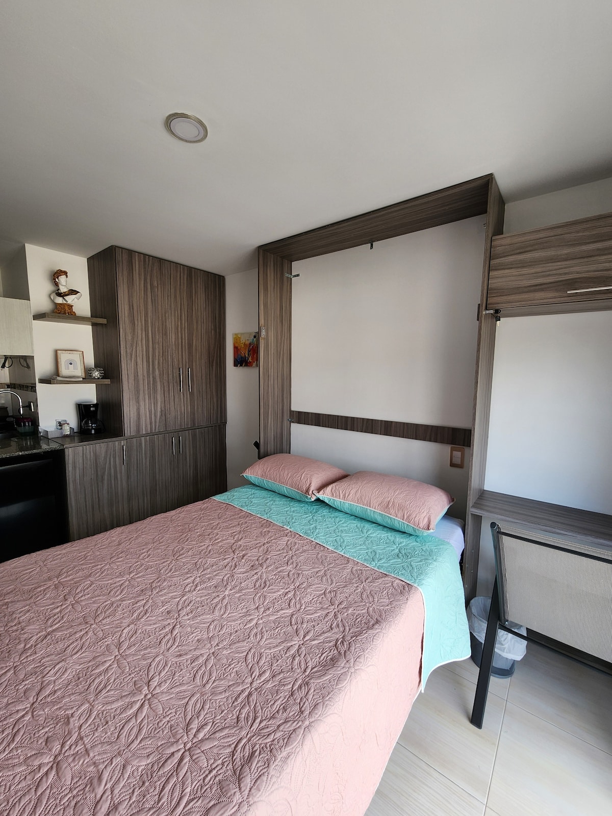 Modern One bedroom apartment with just a short walk to Parque El Lago and Plaza de Bolívar. Brand-new and fully equipped for a comfortable stay. Immerse yourself in Pereira’s vibrant essence right here in the city center. Facing a park with towering trees, mountain views and steps from the central police station. A perfect home base to feel the authentic local vibes.