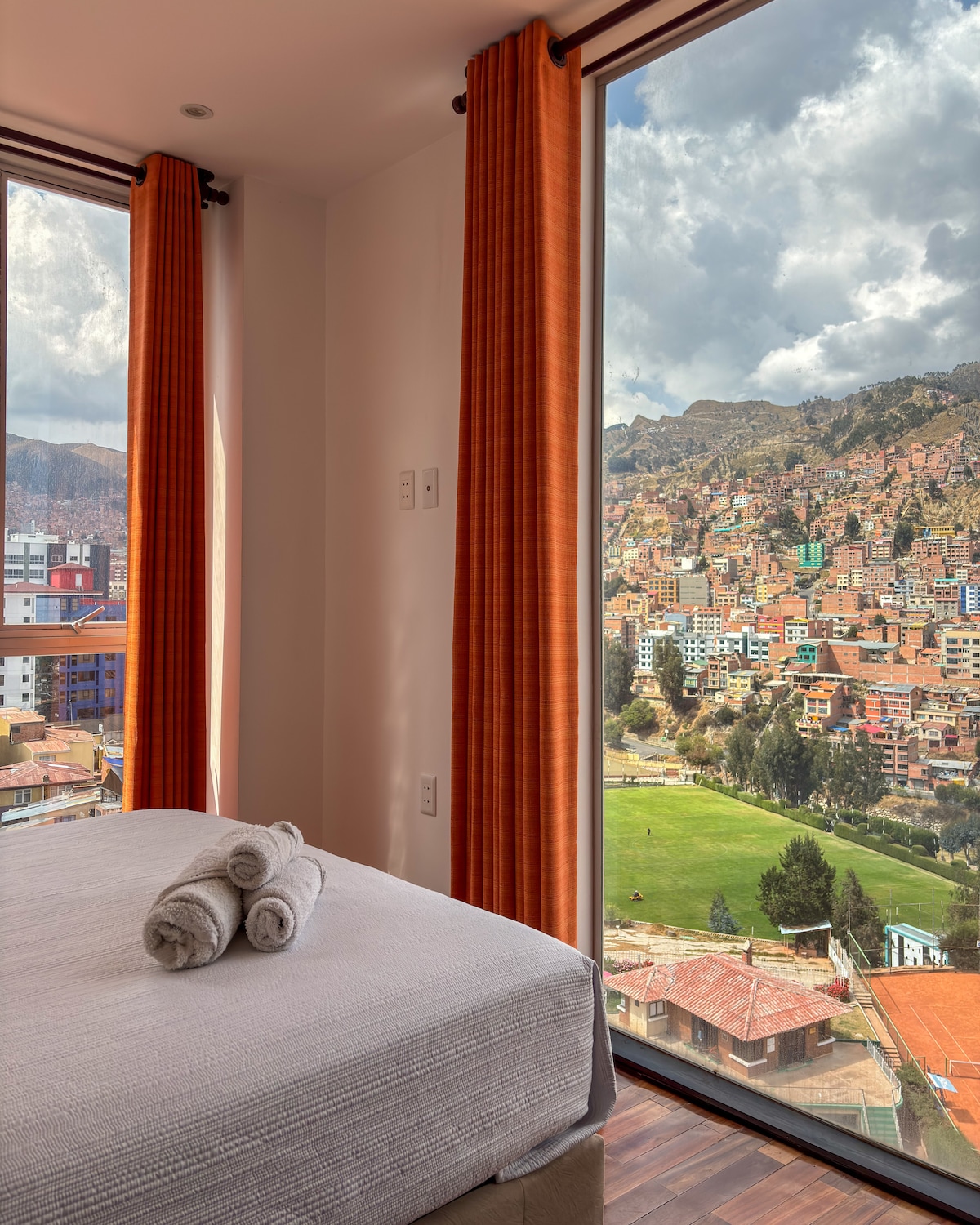Penthause exclusivo con vista panorámica inigualable del "Illimani" y la ciudad. - Ubicado en el corazón de Sopocachi, cerca de supermercados, restaurantes y trasporte público. - Wifi 5G - Cocina independiente, Nexflix, lavadora y agua caliente. - Acceso seguro y privado con ascensores panorámicos y seguridad 24/7 1. Habitación principal cama QUEEN para 1 o 2 personas Dólares 38 (la segunda permanece cerrada) 2. Segunda habitación (opcional) cama doble disponible por 10 dólares por persona.