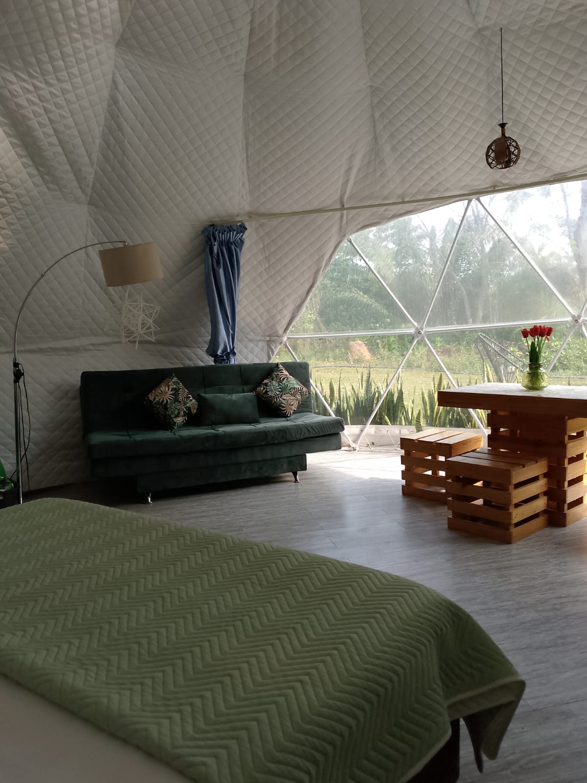 Escape to luxury and tranquility with our glamping experience! Immerse yourself in nature without sacrificing comfort in our beautifully furnished domes. Enjoy stunning views, cozy bedding, and modern amenities. Book your getaway today! The Domo has TV, Wifi, Netflix , yoga mats, boardgames and a private toilet. In the resort you can enjoy the swimming pool, volleyball and football pitch, ride horses and if you like to fish you ca do so in the lake.