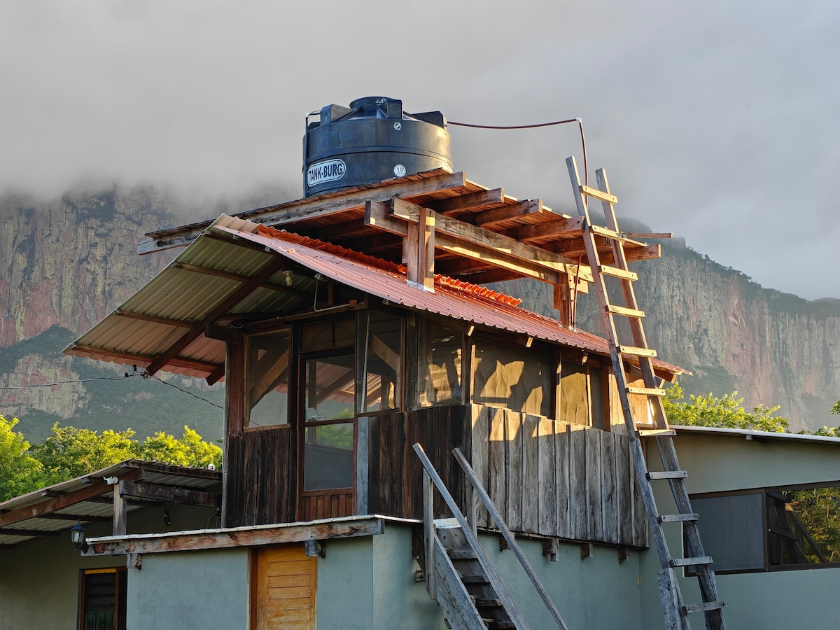 Viva una experiencia diferente! Cabañita de madera, construida debajo una torre de agua, totalmente enmallada - es casi como acampar pero con la comodidad de muebles rústicos, camas y electricidad además tiene una vista espectacular hacia la torre de Chochis y la serranía!