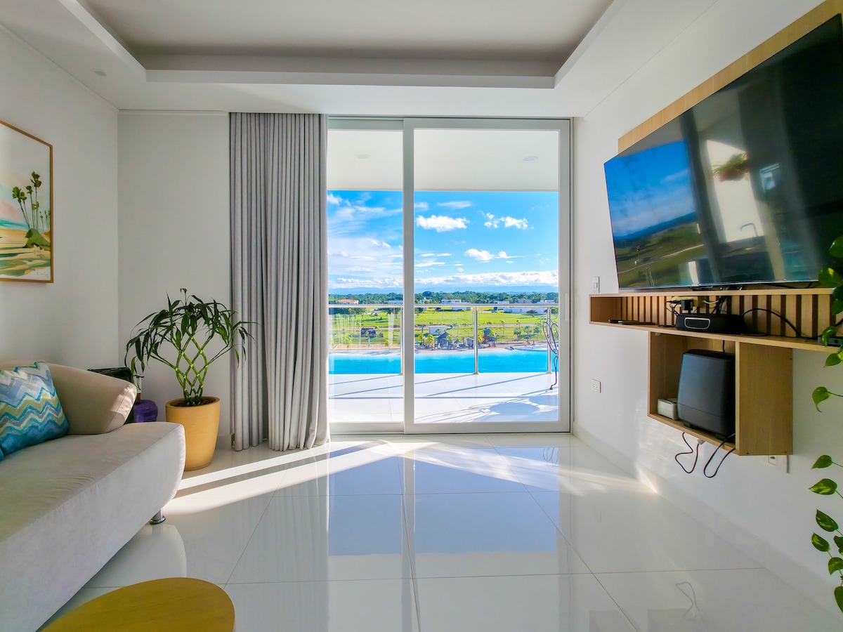 Apartamento en primera fila con vista al mar en planta baja. Caminas solo unos pasos y estarás disfrutando una de las piscinas más grandes de Latinoamérica. Vive un sueño caribeño en pleno corazón de Santa Cruz. Este apartamento de 1 habitación te invita a disfrutar cómodamente con su amplia sala, patio amplio y churrasquera privada con todo el lujo que mereces. Deja cautivarte por la majestuosa playa con agua cristalina en el espacio más bonito y mejor ubicado del condominio.